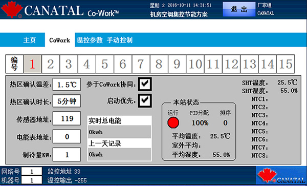 該系統(tǒng)通過為每個(gè)空調(diào)對應(yīng)區(qū)域都增設(shè)了網(wǎng)絡(luò)型溫濕度傳感器節(jié)點(diǎn)(每節(jié)點(diǎn)10通道),以采集機(jī)房整體溫度場數(shù)據(jù)。集控系統(tǒng)根據(jù)采集的數(shù)據(jù)對整個(gè)機(jī)房的空調(diào)設(shè)備參數(shù),溫度場分布進(jìn)行綜合運(yùn)算分析,整體調(diào)度機(jī)房內(nèi)所有空調(diào)的運(yùn)行,均衡控制機(jī)房溫度場,提高整體運(yùn)行效率,達(dá)到節(jié)能目的。